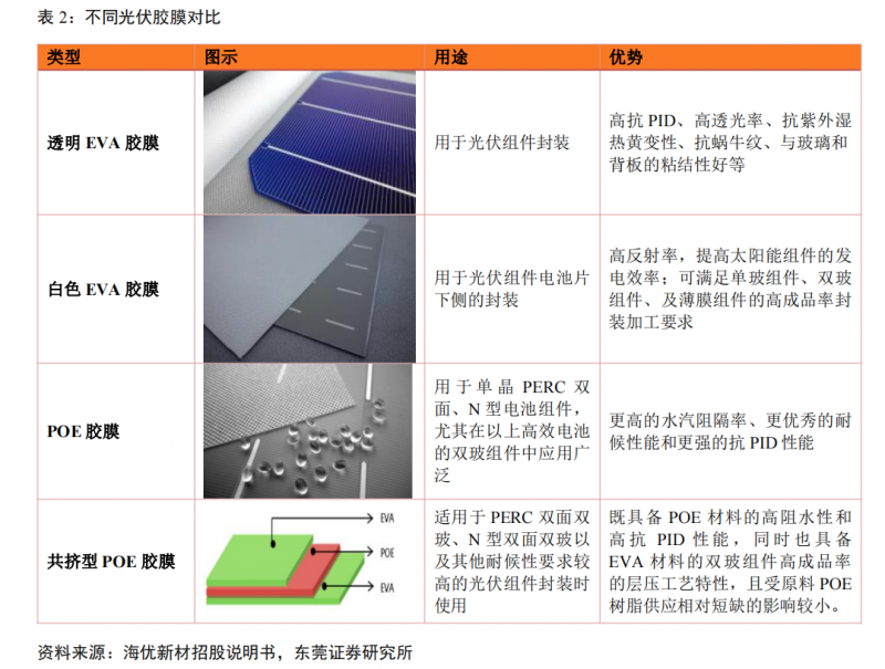 行業(yè)中的主流膠膜原材料共有EVA樹脂和POE樹脂兩大類。根據(jù)具體的性能差異,又可分為透明EVA膠膜、白色EVA膠膜、POE膠膜和共擠POE膠膜四大類。