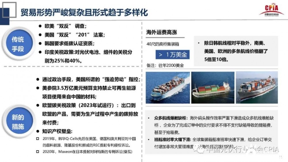 在海外市場中,由于中國六成以上的產(chǎn)品需要出口,而海外市場中貿(mào)易形式嚴(yán)峻復(fù)雜且形式趨于多樣化。如歐美“雙反”調(diào)查、美國“雙反”“201”法案等。同時海外運(yùn)費(fèi)高漲,除日韓航線相對平穩(wěn)外,南美、美國、歐洲的多條航線價格翻了5倍至10倍。