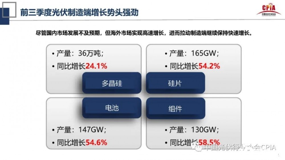 在此次會議上,王勃華對光伏行業(yè)的發(fā)展情況做了詳細(xì)介紹。在光伏制造端方面,他指出,2021年前三季度光伏制造端增長勢頭強(qiáng)勁,在光伏制造端四個環(huán)節(jié)中,多晶硅產(chǎn)量為36萬噸,同比增長24.1%;硅片產(chǎn)量為165GW,同比增長54.2%;電池產(chǎn)量為147GW,同比增長54.6%;組件產(chǎn)量為130GW,同比增長58.5%。他表示,盡管國內(nèi)市場發(fā)展不及預(yù)期,但海外市場實(shí)現(xiàn)了高速增長,進(jìn)而拉動光伏制造端繼續(xù)保持快速增長。因此,光伏制造端在今年仍處于快速發(fā)展中。