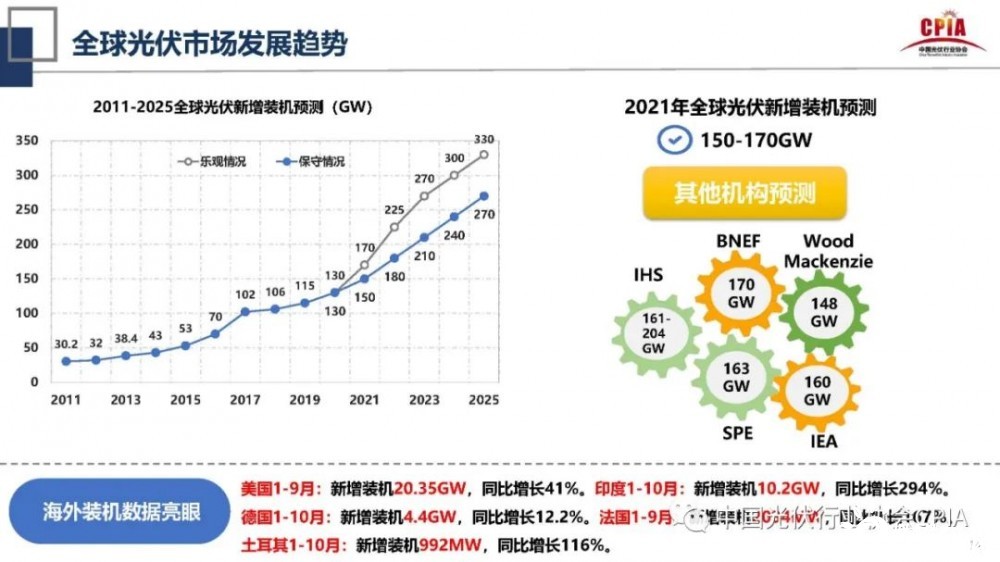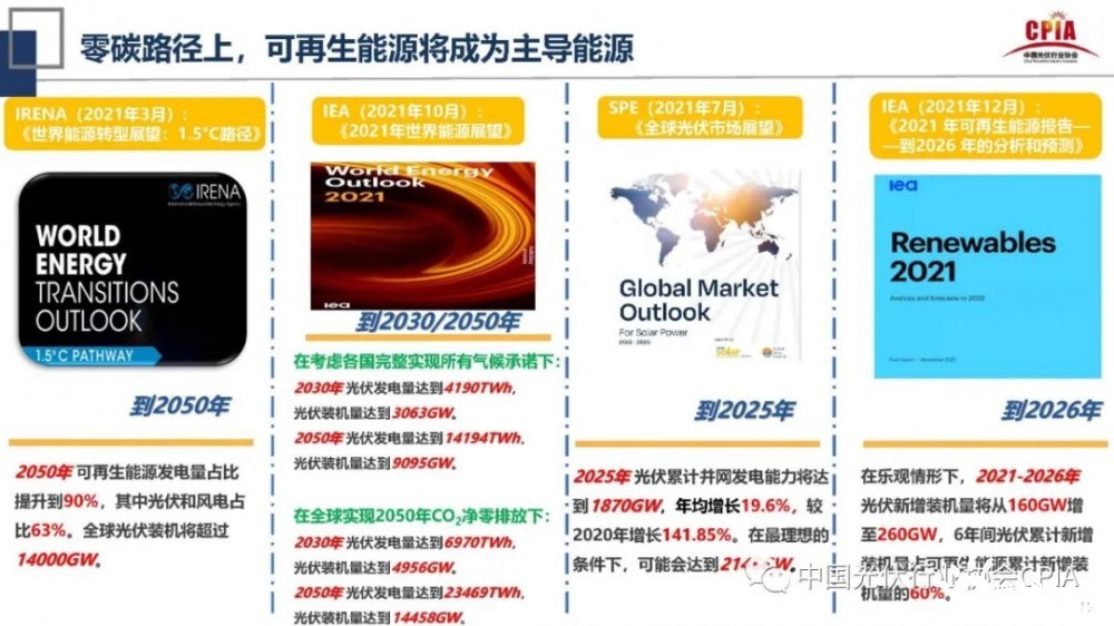 根據(jù)國際著名的研究機(jī)構(gòu)預(yù)測,到2050年可再生能源發(fā)電量占比提升到90%,其中光伏和風(fēng)電占比63%,全球光伏裝機(jī)將超過14000GW。而在比較樂觀的情形下,2021-2026年光伏新增裝機(jī)將從160GW增到260GW,6年間光伏累計(jì)新增裝機(jī)量占可再生能源累計(jì)新增裝機(jī)量的60%。2021年全球光伏新增裝機(jī)預(yù)測達(dá)150-170GW。
