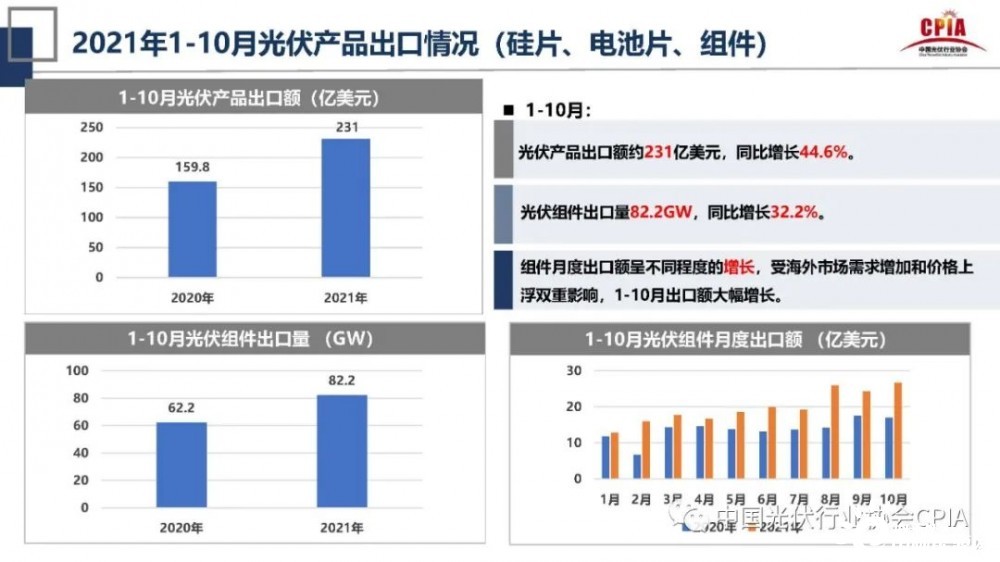 在光伏產(chǎn)品出口方面,今年中國實(shí)現(xiàn)了硅片、電池片、組件等產(chǎn)品出口,1-10月光伏產(chǎn)品出口額約231億美元,同比增長44.6%。王勃華指出:“今年是光伏產(chǎn)品出口額在歷史上第三個超過200億美元的年份。”
