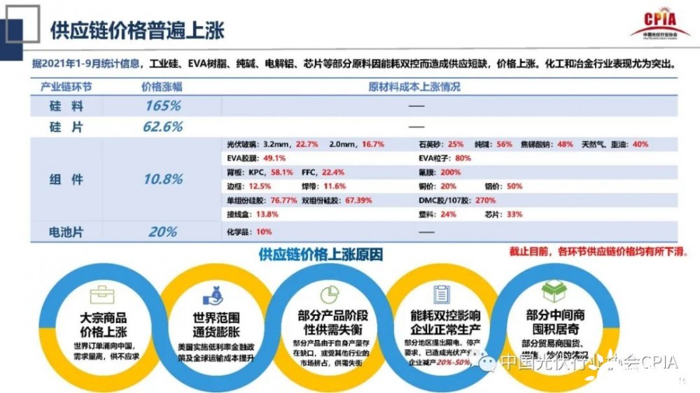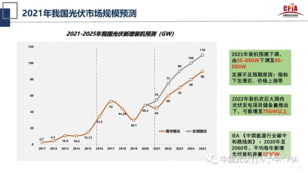 據(jù)此,王勃華表示,供應(yīng)鏈價格的上漲尤其會影響到光伏裝機(jī)的預(yù)測。他說:“今年光伏裝機(jī)量預(yù)測要下調(diào),由原來的55-65GW下調(diào)至45-55GW,發(fā)展不及預(yù)期的原因?yàn)橹笜?biāo)下發(fā)滯后、價格上漲等所致。但是2022年光伏裝機(jī)在國內(nèi)巨大的光伏發(fā)電項(xiàng)目儲備量推動下,可能會增至75GW以上。”