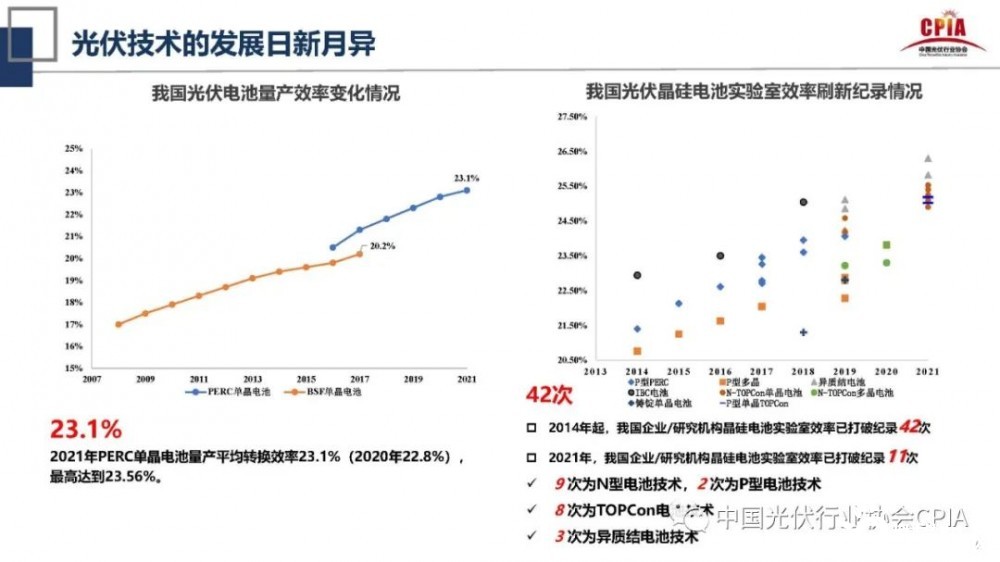 在光伏技術(shù)方面,王勃華形容其為“日新月異”。特別在轉(zhuǎn)換效率方面,2021年我國PERC單晶電池量平均轉(zhuǎn)換效率達(dá)23.1%,最高達(dá)到23.56%。而2020年僅有22.8%。在光伏晶硅電池實(shí)驗(yàn)室效率方面,從2014年起至今8年時間,我國企業(yè)/研究機(jī)構(gòu)晶硅電池實(shí)驗(yàn)室效率已打破紀(jì)錄42次,2021年,我國企業(yè)/研究機(jī)構(gòu)晶硅電池實(shí)驗(yàn)室效率已打破紀(jì)錄11次。其中,9次為N型電池技術(shù),2次為P型電池技術(shù),8次為TOPCon電池技術(shù),3次為異質(zhì)結(jié)電池技術(shù)。