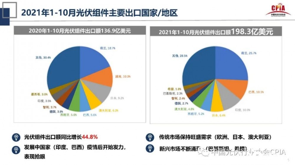 緊接著,王勃華對2020年和2021年光伏組件主要出口國家/地區(qū)做了介紹。2021年1-10月光伏組件出口額為198.3億美元,其中,歐洲、日本、澳大利亞等傳統(tǒng)市場國家保持旺盛需求,巴基斯坦、希臘等新興市場也不斷涌現(xiàn)出來。對比2020年,2020年1-10月光伏組件出口額為136.9億美元,同比增長44.8%,其中,印度、巴西等發(fā)展中國家在疫情后開始發(fā)力,表現(xiàn)十分搶眼。