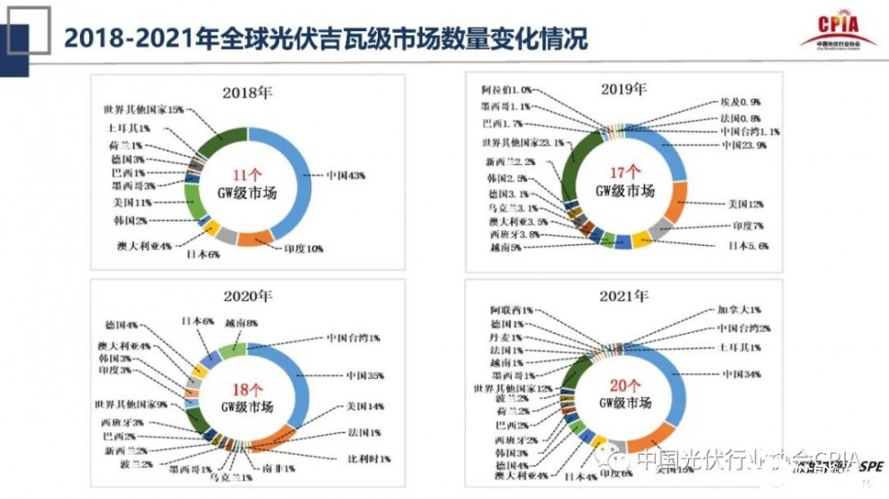 王勃華還指出,根據(jù)統(tǒng)計(jì),2018年-2021年全球光伏吉瓦級市場數(shù)量達(dá)20個,根據(jù)預(yù)測,2022年將達(dá)到26個。王勃華表示,光伏吉瓦級市場的增加,增強(qiáng)了我們在國際貿(mào)易中抗沖擊能力和抗打擊能力。