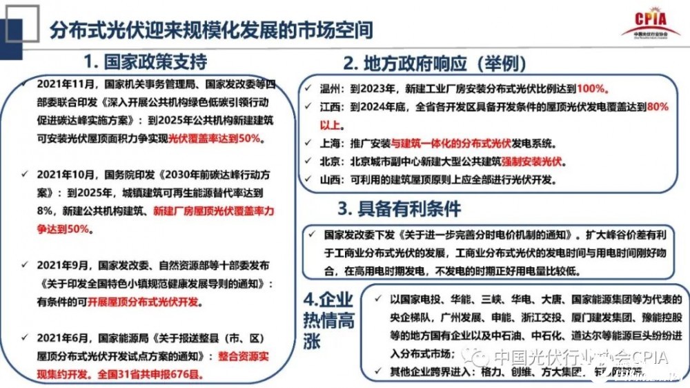 王勃華還指出,未來分布式光伏將迎來規(guī)?;l(fā)展的市場空間。究其原因是,第一,國家、地方政策的支持,以央企為梯隊(duì),地方國有企業(yè)和跨界能源巨頭企業(yè)為代表紛紛進(jìn)入分布式市場。第二,光伏盈利模式、商業(yè)模式的多元化。盈利上光伏電站收益新增綠電交易和碳交易(CCER)等盈利模式,商業(yè)模式方面是綜合能源服務(wù)和光伏與電動汽車融合發(fā)展。