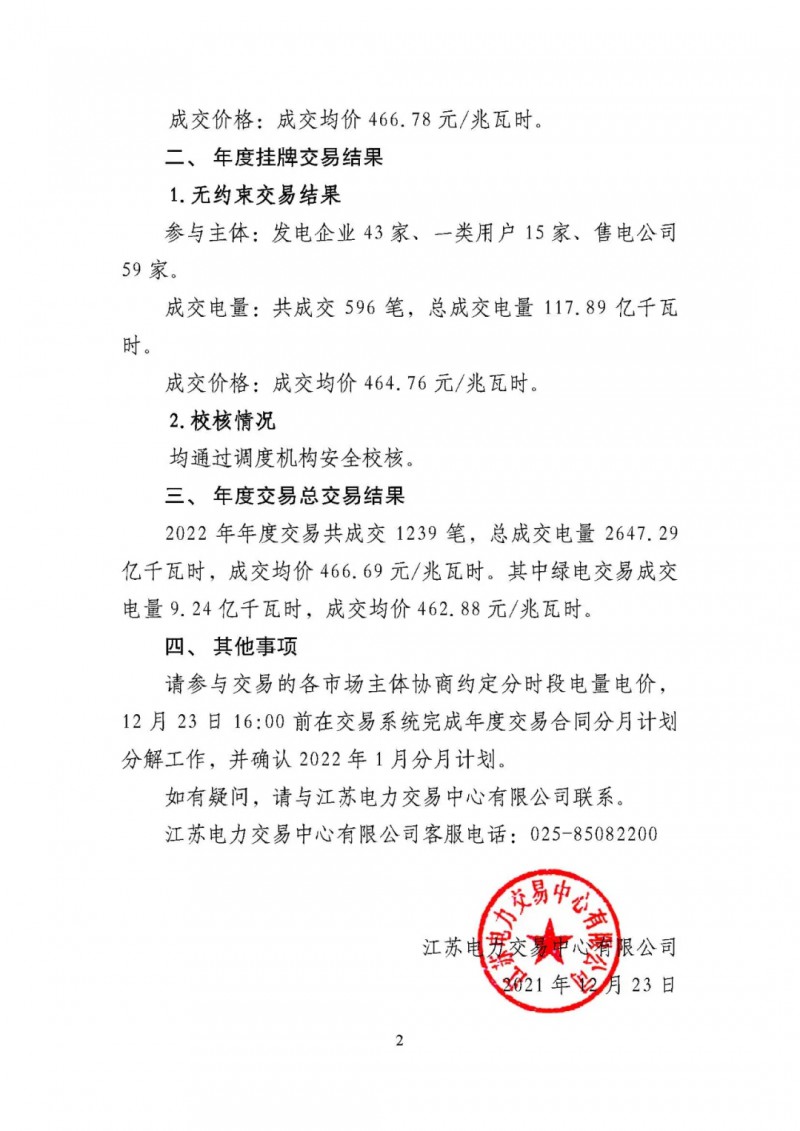 12月23日,江蘇電力交易中心有限公司發(fā)布了2022年江蘇電力市場年度交易結果。江蘇電力交易中心有限公司于2021年12月13日至12月17日開展了年度雙邊協(xié)商交易,于12月16日至17日、20日至21日開展了年度掛牌交易。