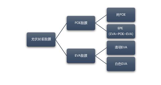 當(dāng)前光伏膠膜市場主流產(chǎn)品為EVA膠膜和POE膠膜兩種,其中EVA膠膜又分成透明EVA膠膜和白色EVA膠膜,POE膠膜則包含純POE膠膜和共擠POE膠膜(即EPE膠膜)。