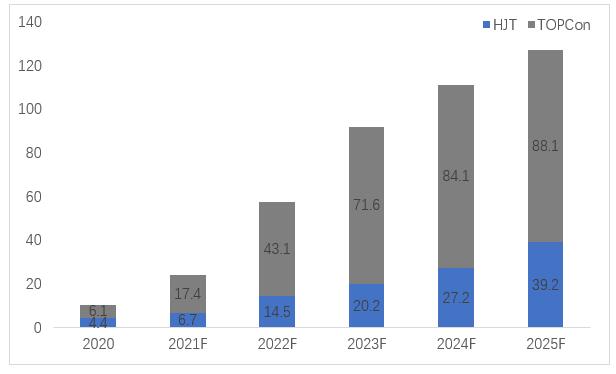 根據(jù)中國光伏行業(yè)的數(shù)據(jù),2020年P(guān)型PERC單晶電池量產(chǎn)轉(zhuǎn)化效率行業(yè)均值為22.8%,2021年有望超越23%,基本已經(jīng)達(dá)到了量產(chǎn)性能極限,N型電池接棒P型漸行漸近。