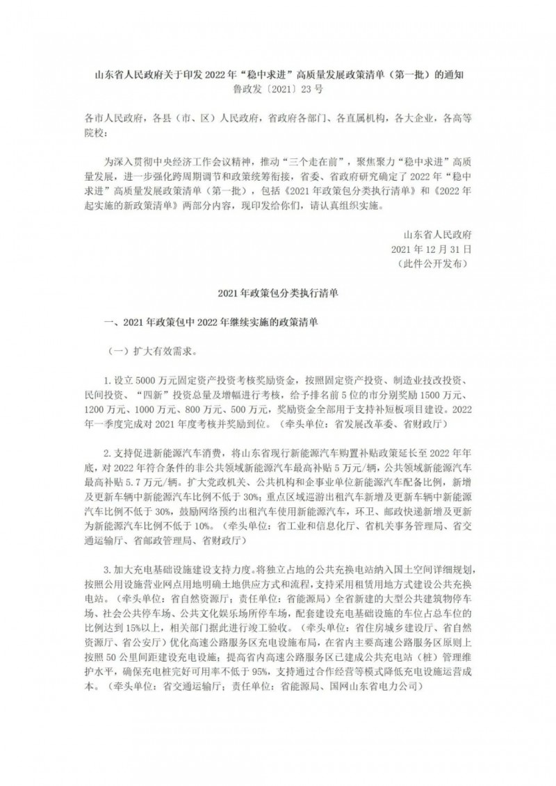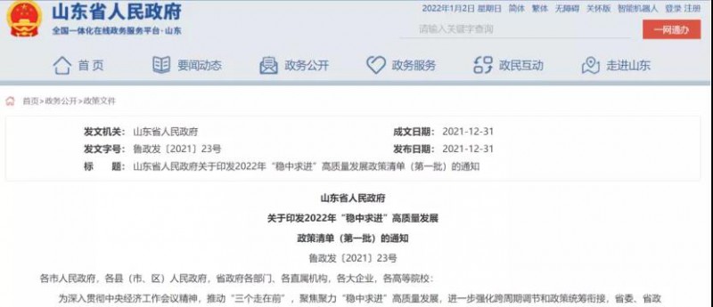 12月31日,山東省人民政府印發(fā)2022年“穩(wěn)中求進(jìn)”高質(zhì)量發(fā)展政策清單(第一批)的通知,提出了共178項優(yōu)惠政策。