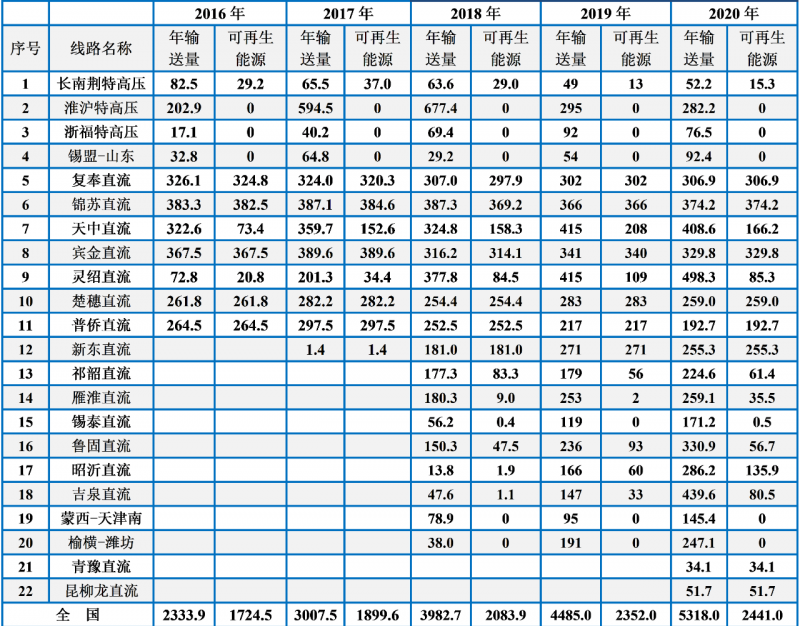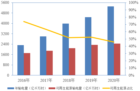 “十三五”期間,我國特高壓工程建設(shè)進展迅速,特高壓線路輸送電量和輸送可再生能源電量逐年增加,“西電東送”工程穩(wěn)步向前,但輸送可再生能源電量的比重反而在下降,2020年我國22條特高壓輸送通道平均可再生能源占比為46%,創(chuàng)下近五年新低。2021年10月24日,國務(wù)院印發(fā)的《2030年前碳達峰行動方案》提出“嚴控跨區(qū)外送可再生能源電力配套煤電規(guī)模,新建通道可再生能源電量比例原則上不低于50%。”可以預(yù)見,隨著全社會對碳達峰、碳中和目標(biāo)形成共識以及國家政策引導(dǎo),清潔能源占比將持續(xù)提升。