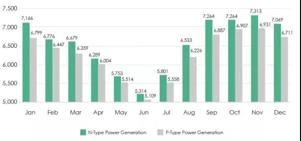 該項(xiàng)目位于澳大利亞東北部昆士蘭州,具有亞熱帶季風(fēng)氣候特性,全年分干濕兩季。該研究目的是對(duì)比163尺寸60片N型和P型組件發(fā)電增益的不同,其中項(xiàng)目總?cè)萘渴?.5MW,逆變器型號(hào)為古瑞瓦特80kW,所有組件都在白漆鋼結(jié)構(gòu)屋頂上方1米以上位置安裝,傾斜角度15度。上表顯示了2020年1月至2020年12月兩種組件的發(fā)電量:與P型雙面組件相比,N型雙面組件單瓦和背面發(fā)電量顯著提升,整體發(fā)電量增加了5%。