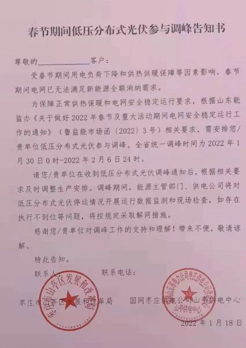 隨后,各地級市也根據精神,下發(fā)了《春節(jié)期間低壓分布式光伏參與調峰告知書》。