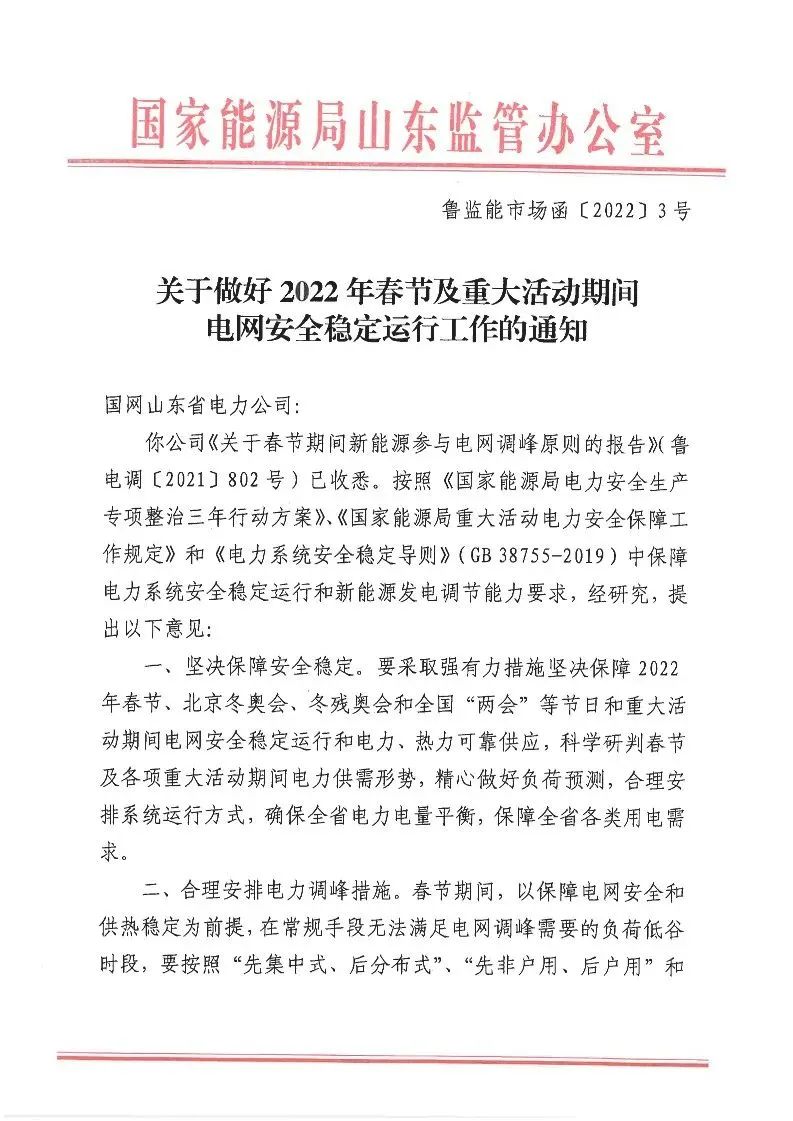 2022年1月22日,國家能源局山東監(jiān)管辦公室發(fā)布《關于做好 2022年春節(jié)及重大活動期間電網安全穩(wěn)定運行工作的通知》,提出: