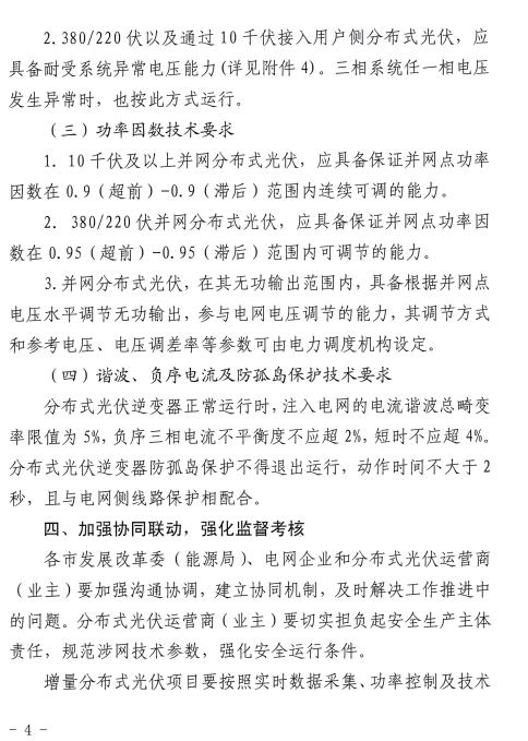近日,國家能源局山東監(jiān)管辦公室 山東省能源局發(fā)布關(guān)于切實做好分布式光伏并網(wǎng)運行工作的通知,通知指出四點,一、加強接入能力評估,做好分布式光伏接網(wǎng)工作;二、強化安全運行條件,實現(xiàn)分布式光伏精準監(jiān)控調(diào)度;三、規(guī)范涉網(wǎng)技術(shù)參數(shù),保證分布式光伏并網(wǎng)性能;四、加強協(xié)同聯(lián)動,強化監(jiān)督考核。