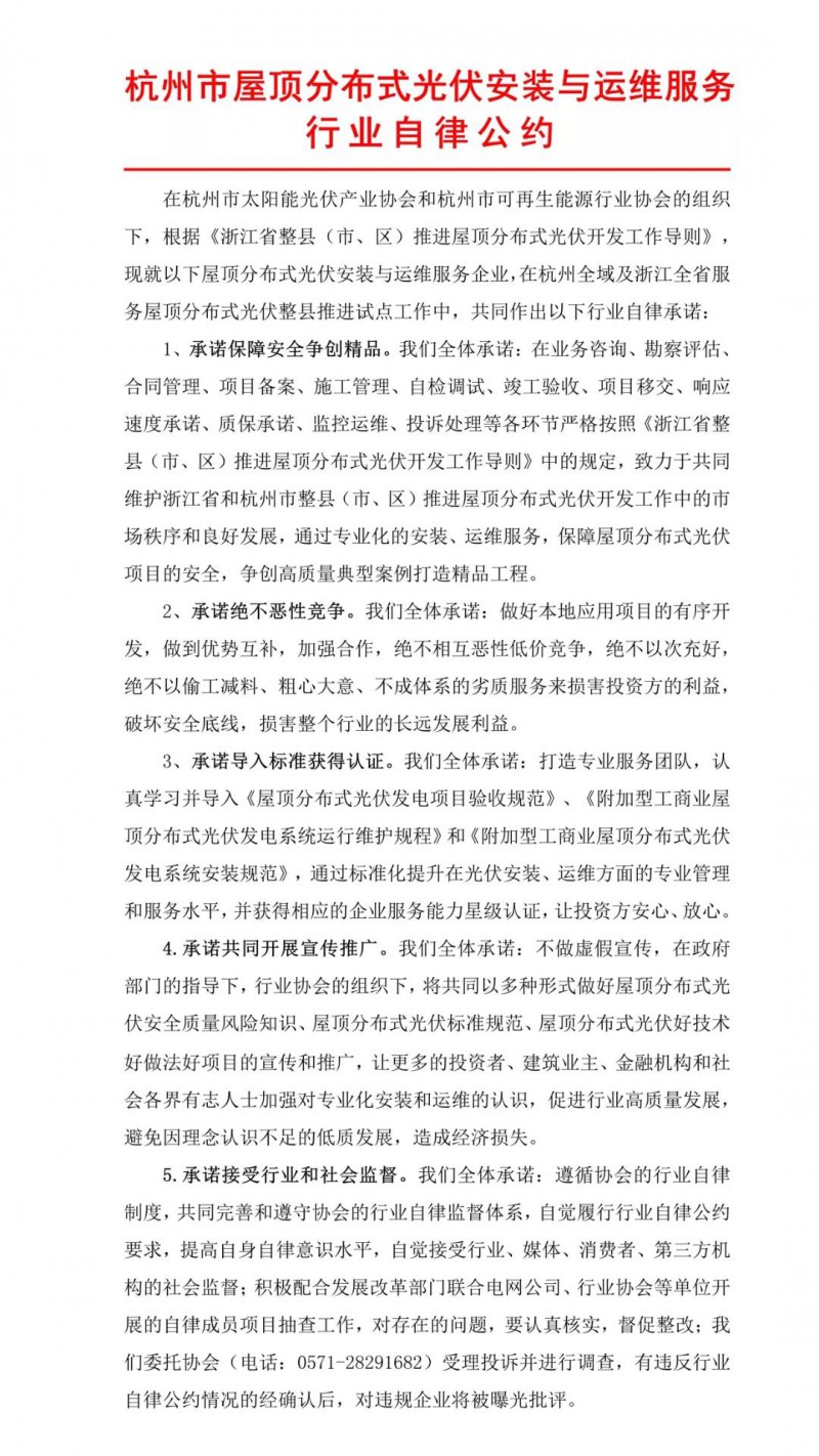 為踐行該《導(dǎo)則》在杭州全域及浙江全省的推廣應(yīng)用,在杭州市太陽(yáng)能光伏產(chǎn)業(yè)協(xié)會(huì)和杭州市可再生能源行業(yè)協(xié)會(huì)的組織下,浙江正泰新能源開(kāi)發(fā)有限公司、龍焱能源科技(杭州)有限公司、杭州桑尼能源科技股份有限公司、杭州福斯特光伏發(fā)電有限公司、杭州帷盛科技有限公司、德鄰聯(lián)合工程有限公司、浙江交投新能源投資有限公司、浙江天裕能源有限公司、浙江維旺合縱能源科技有限公司、杭州城市能源有限公司、泛太能源環(huán)境(浙江)有限公司、浙江寰泰新能源有限公司、浙江拓華能源科技有限公司、潔云電力工程(杭州)有限公司、杭州眾能光電科技有限公司共十五家光伏企業(yè),根據(jù)《導(dǎo)則》條款,聯(lián)合簽署了《杭州市屋頂分布式光伏安裝與運(yùn)維服務(wù)行業(yè)自律公約》,帶頭向社會(huì)公開(kāi)承諾加強(qiáng)行業(yè)自律,共同維護(hù)浙江省和杭州市整縣(市、區(qū))推進(jìn)屋頂分布式光伏開(kāi)發(fā)工作中的市場(chǎng)秩序和良好發(fā)展。