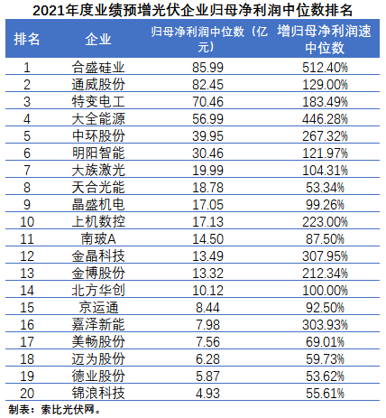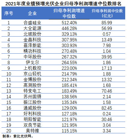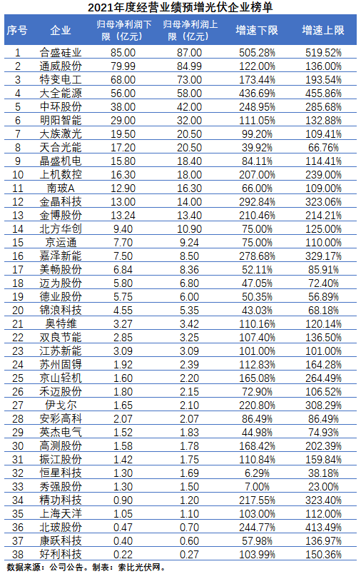 除了這38家企業(yè)以外,其實還有相當多的光伏企業(yè)在2021年經營業(yè)績亦呈增長態(tài)勢,只是它們沒有達到業(yè)績預告的披露標準而已。