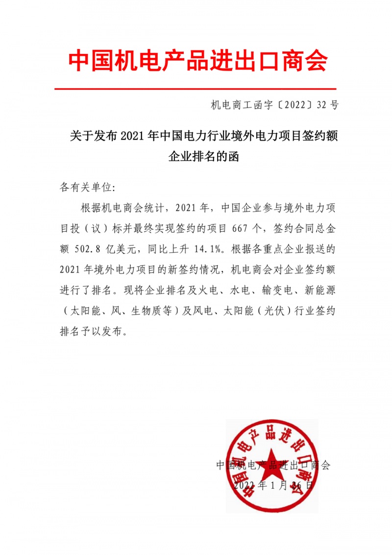 1月26日,中國機(jī)電產(chǎn)品進(jìn)出口商會發(fā)布中國企業(yè)參與境外電力項(xiàng)目投(議)標(biāo)并最終實(shí)現(xiàn)簽約的項(xiàng)目667個,簽約合同總金額502.8億美元,同比上升14.1%。并對火電、水電、輸變電、新能源(太陽能、風(fēng)、生物質(zhì)等)及風(fēng)電、太陽能(光伏)行業(yè)簽約額進(jìn)行了排名。