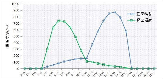 圖3為典型日的正面背面輻照度比較,輻照度大小與太陽的方位有關(guān)。上午時刻,太陽的方位位于東面,組件背面主要接收直接輻射、地面的反射和大氣中的散射輻射,組件正面主要接收大氣中的散射輻射和地面的一部分反射輻射,而到了下午正好相反。