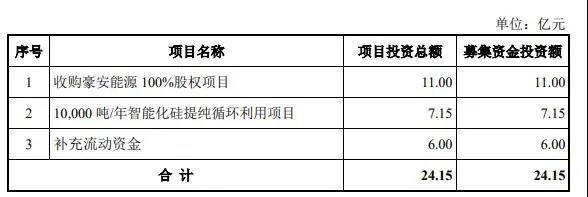同時(shí),公告顯示,公司擬非公開(kāi)發(fā)行股票募資不超24.15億元,用于收購(gòu)豪安能源100%股權(quán)、1萬(wàn)噸/年智能化硅提純循環(huán)利用項(xiàng)目及補(bǔ)充流動(dòng)資金。