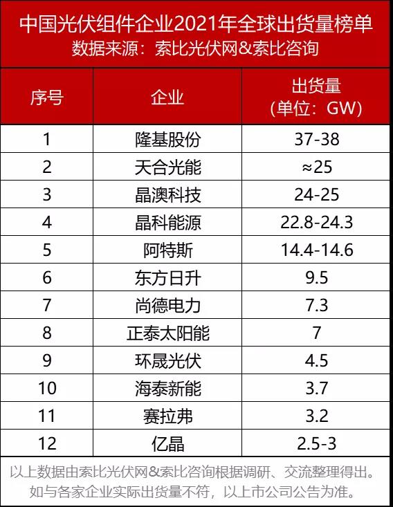 從索比光伏網(wǎng)&索比咨詢發(fā)布的《中國光伏組件企業(yè)2021年全球出貨量榜單》看,隆基股份、天合光能、晶澳科技、晶科能源、阿特斯、東方日升、尚德電力、正泰太陽能、環(huán)晟光伏、海泰新能、賽拉弗、億晶光電等企業(yè)名列前茅,出貨量合計(jì)約140GW,占全球組件總需求的75%以上。無論在國內(nèi)還是海外市場(chǎng),他們都斬獲頗豐。