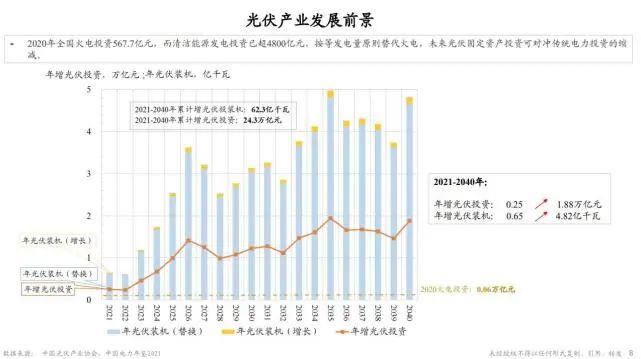 按照剛才的演進路徑,光伏產(chǎn)業(yè)投資假如從2021年開始,新增的電源都是由光伏裝機來實現(xiàn),那么下面這張圖就展示了未來的20年的一個投資逐漸增加的過程,從開始大概0.25萬億,到后來大概2萬億的年投資,整個全過程完成約20年,總共的投資規(guī)模大概是20多萬億元。