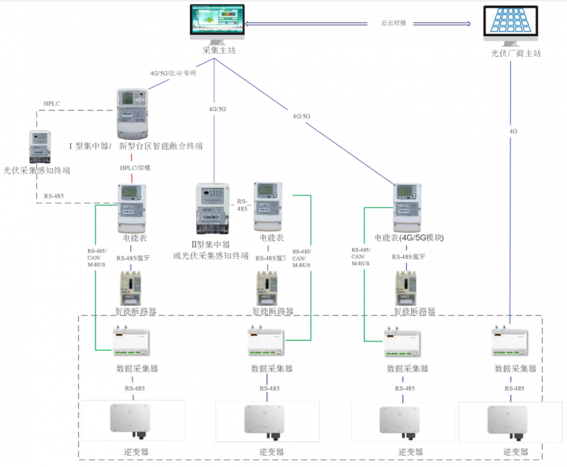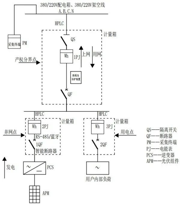 要實(shí)現(xiàn)上述目標(biāo),低壓分布式光伏計(jì)量采集需要安裝的主要設(shè)備包括:采集終端、智能電能表、電流互感器、智能斷路器、防/反孤島保護(hù)裝置等