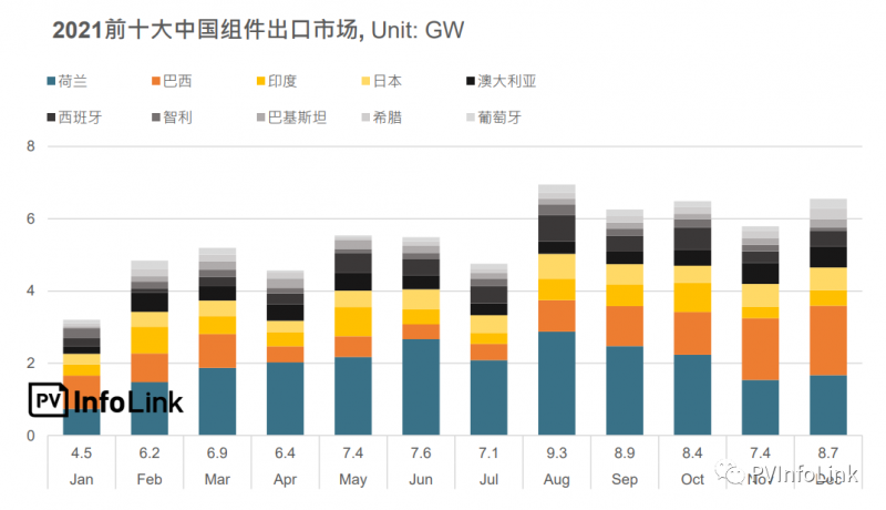 中國(guó)2021年出口了40.9GW的組件到歐洲市場(chǎng),相較前一年的26.7GW同比成長(zhǎng)了54%。受惠于能源轉(zhuǎn)型趨勢(shì),歐洲持續(xù)維持最大的組件進(jìn)口市場(chǎng),全球占比46%。主要的國(guó)家包括了荷蘭、西班牙、希臘、葡萄牙、波蘭和德國(guó),都達(dá)到了GW級(jí)以上的進(jìn)口量,其中荷蘭為中國(guó)的第一大出口國(guó),全年總量來(lái)到了23.8GW。但是在十一月時(shí),受到了歐洲法院專利判決的影響,部分廠家無(wú)法銷(xiāo)售受影響產(chǎn)品,進(jìn)口量快速下滑。