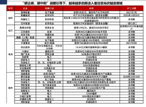 近年來光伏產(chǎn)業(yè)發(fā)展迅速,疫情、產(chǎn)業(yè)鏈漲價等因素下仍屢創(chuàng)新高,跨界入局者屢見不鮮,成功者也不在少數(shù),前有華為的逆變器、比亞迪的組件,后有高景的硅片、金陽新能源的異質(zhì)結(jié),吉利、順豐、長城、同德化工、海螺水泥、和邦生物等實力玩家也紛紛入場。