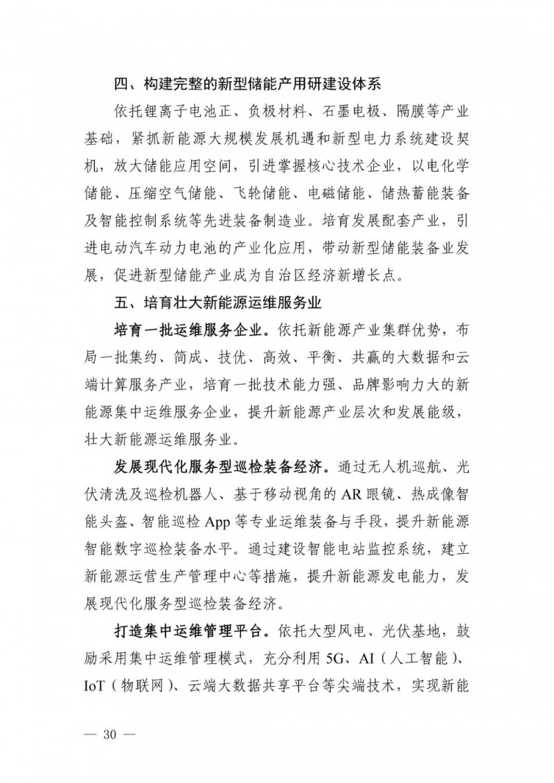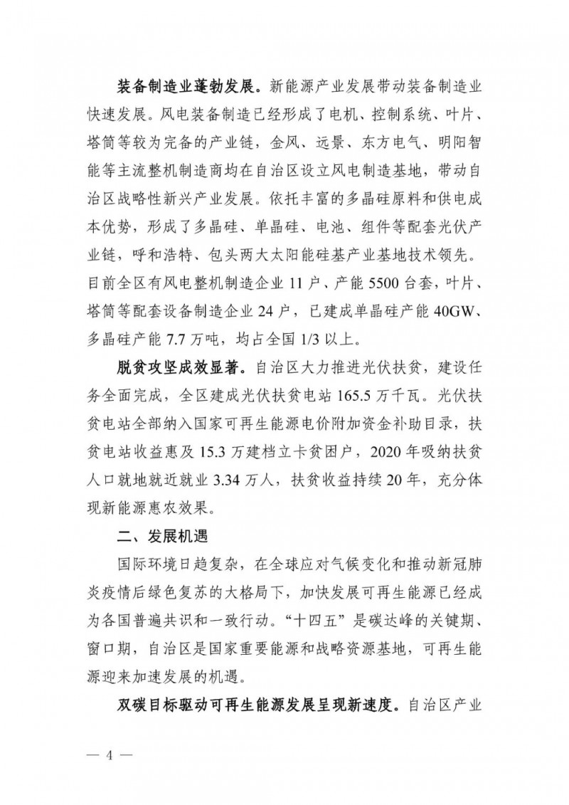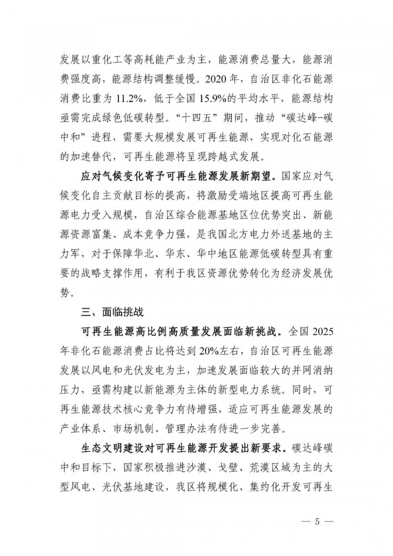 可再生能源發(fā)電目標(biāo)。自治區(qū)可再生能源發(fā)電裝機(jī)達(dá)到 1.35 億千瓦以上,其中風(fēng)電 8900 萬千瓦、光伏發(fā)電 4500 萬千瓦,新能源裝機(jī)規(guī)模超過燃煤火電裝機(jī)規(guī)模,新能源發(fā)電量占自治區(qū)總發(fā)電量比重超過35%。“十四五”期間可再生能源新增裝機(jī) 8000 萬千瓦以上,占全部新增裝機(jī)的比重超過 60%,成為新增裝機(jī)的主力。