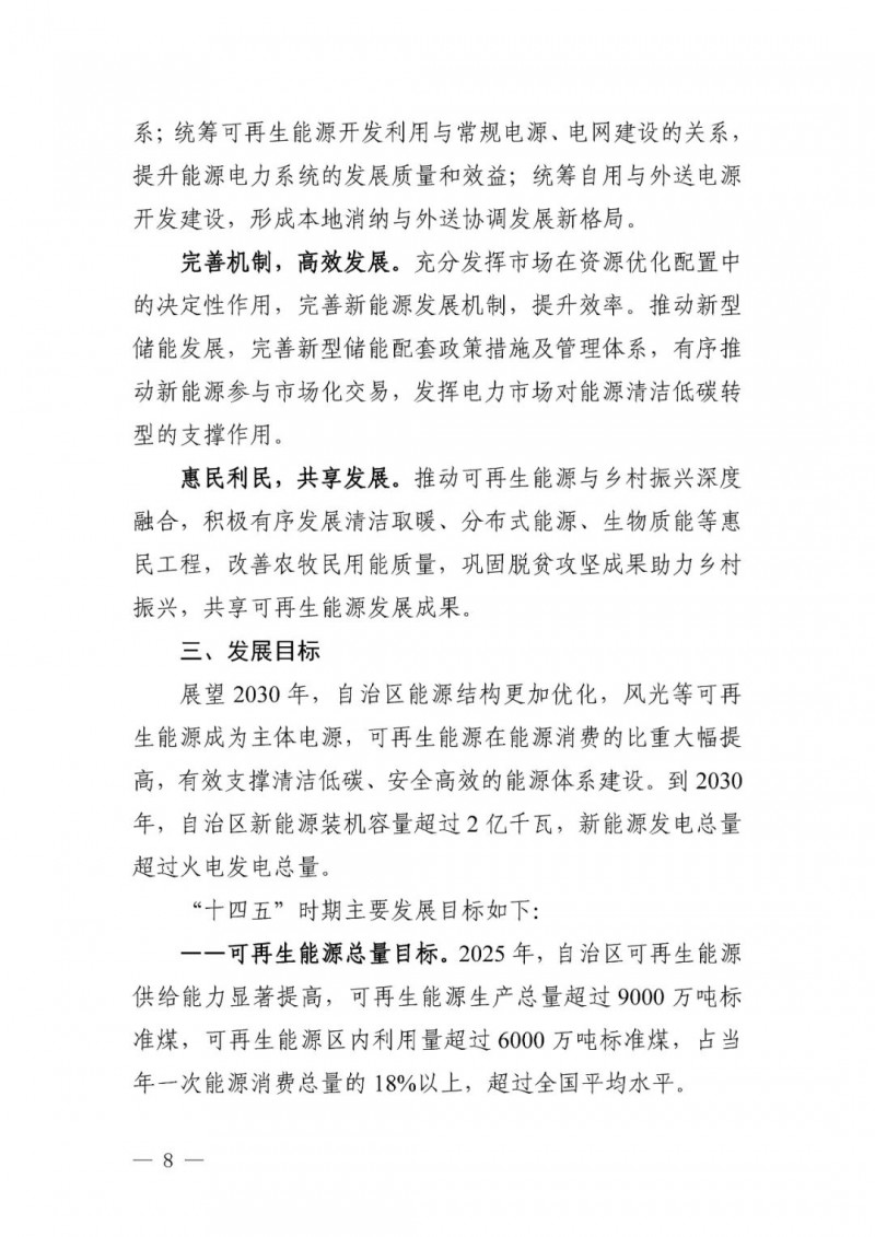 可再生能源總量目標(biāo)。至2025 年,自治區(qū)可再生能源生產(chǎn)總量超過 9000萬噸標(biāo)準(zhǔn)煤,可再生能源區(qū)內(nèi)利用量超過6000萬噸標(biāo)準(zhǔn)煤,占當(dāng)年一次能源消費(fèi)總量的18%以上,超過全國(guó)平均水平。