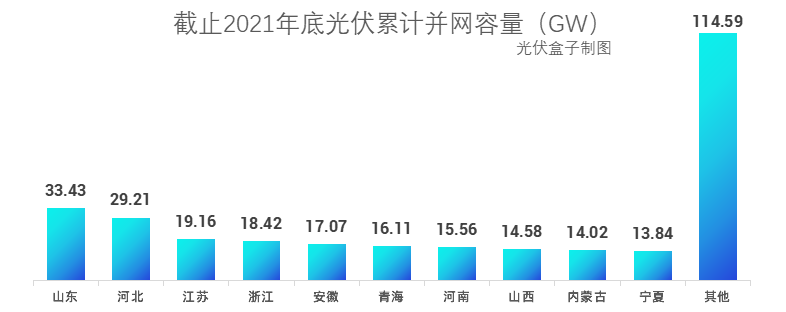 截至2021年底,累計(jì)光伏裝機(jī)容量排名前3的省份分別是山東省(33.43GW)、河北省(29.21GW)、江蘇省(19.16GW)。