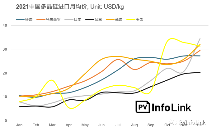 多晶硅市場(chǎng)在2021年經(jīng)歷了較大的動(dòng)蕩,因整體光伏供應(yīng)鏈的產(chǎn)能錯(cuò)配,使得硅料價(jià)格整年大都維持上漲態(tài)勢(shì)。除了中國(guó)國(guó)內(nèi)市場(chǎng)多晶硅交易價(jià)格上漲外,連帶使得價(jià)格相對(duì)平穩(wěn)的海外料價(jià)格也出現(xiàn)較大的波動(dòng),全年價(jià)格趨勢(shì)同樣呈現(xiàn)上升趨勢(shì)。PV Infolink透過(guò)統(tǒng)計(jì)2020 – 2021中國(guó)海關(guān)的多晶硅進(jìn)口信息,分析變化原因與未來(lái)影響。