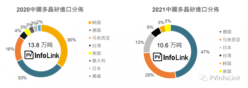 2021年進(jìn)口多晶硅主要來(lái)自德國(guó)和馬來(lái)西亞,兩者占比達(dá)到了75%,主因兩國(guó)擁有瓦克和OCI兩家目前生產(chǎn)較為穩(wěn)定的非中國(guó)廠家。與2020年比較,出口多晶硅到中國(guó)的國(guó)家數(shù)量減少,且過(guò)去占據(jù)進(jìn)口量第一名的韓國(guó)占比快速縮小,在韓國(guó)國(guó)內(nèi)生產(chǎn)設(shè)施目前沒(méi)有重啟的意愿下,預(yù)期未來(lái)占比將趨近于0%。其他來(lái)自日本或是臺(tái)灣的多晶硅進(jìn)口,因該地區(qū)沒(méi)有多晶硅生產(chǎn)設(shè)施,可能是過(guò)去所簽訂的多晶硅長(zhǎng)單未完全使用而轉(zhuǎn)售,但也僅有小量的占比。