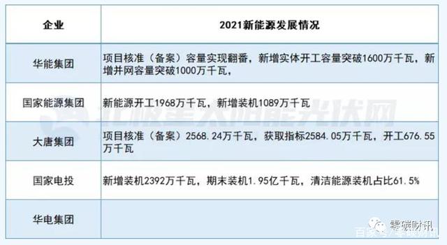 公開數(shù)據(jù)顯示,2021年,華能集團實現(xiàn)新能源新增并網(wǎng)超1000萬千瓦,實體開工超1600萬千瓦、國家能源集團新能源開工1968萬千瓦,新增裝機1089萬千瓦、大唐集團新能源項目核準(備案)2568.24萬千瓦,獲取指標2584.05萬千瓦。