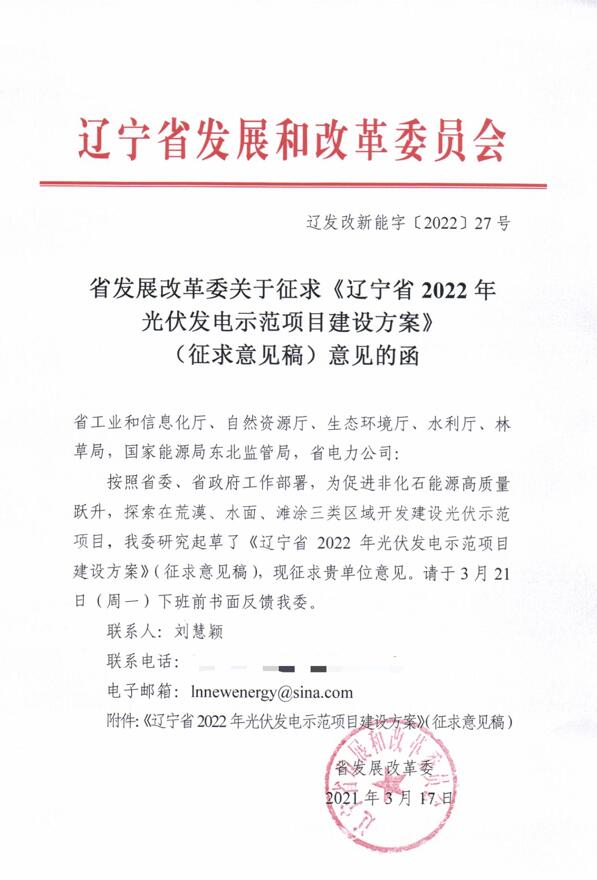 3月17日,遼寧省發(fā)展改革委關(guān)于征求《遼寧省2022年光伏發(fā)電示范項(xiàng)目建設(shè)方案》(征求意見稿)意見的函。