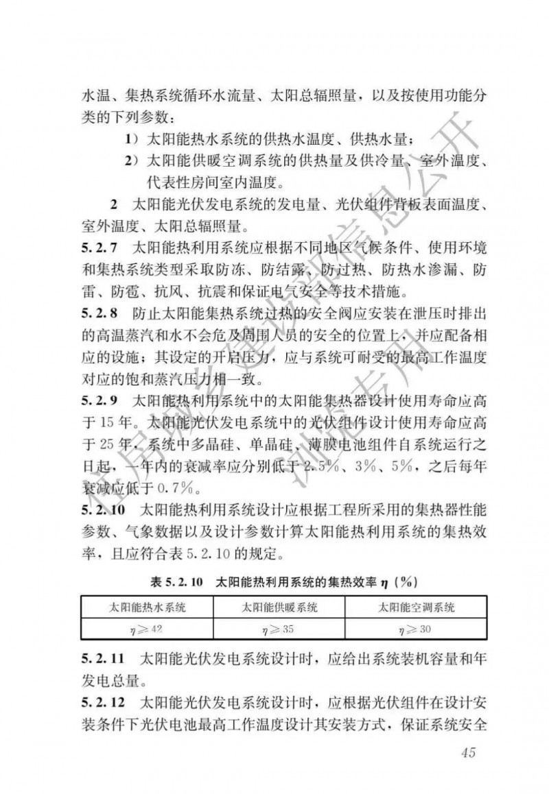 光伏:《規(guī)范》要求新建建筑應安裝太陽能系統(tǒng)。太陽能熱利用系統(tǒng)中的太陽能集熱器設計使用壽命應高于15年。太陽能光伏發(fā)電系統(tǒng)中的光伏組件設計使用壽命應高于25年,系統(tǒng)中多晶硅、單晶硅、薄膜電池組件自系統(tǒng)運行之日起,十年內的衰減率應分別低于2.5%、3%、5%,之后每年衰減應低于0.7%。