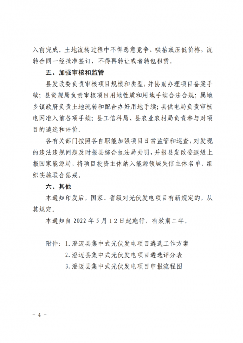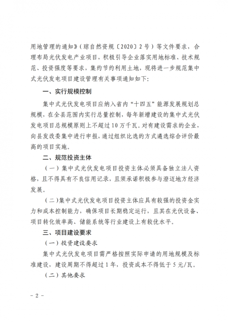 4月11日,澄邁縣發(fā)展和改革委員會、澄邁縣自然資源和規(guī)劃局、澄邁縣農(nóng)業(yè)農(nóng)村局、澄邁縣工業(yè)信息化和科學(xué)技術(shù)局聯(lián)合發(fā)布了《關(guān)于進一步規(guī)范集中式光伏發(fā)電項目建設(shè)管理的通知》。本通知自2022年5月12日起施行,有效期2年。