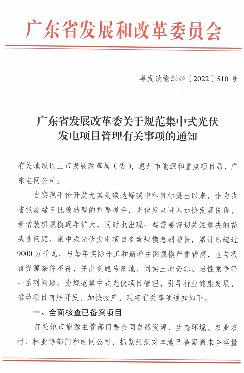 廣東發(fā)改委發(fā)布《關(guān)于規(guī)范集中式光伏發(fā)電項目管理有關(guān)事項的通知》,全面整頓全省光伏。