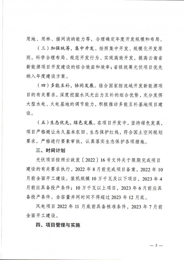 在時(shí)間計(jì)劃上,光伏項(xiàng)目按照2022年8月前完成項(xiàng)目備案,2022年10月前全面開工建設(shè)。裝機(jī)規(guī)模10萬千瓦及以下項(xiàng)目,2023年4月前應(yīng)具備投產(chǎn)條件;10萬千瓦以上項(xiàng)目,2023年6月前應(yīng)具備投產(chǎn)條件。全容量并網(wǎng)時(shí)間不得超過2023年12月底。風(fēng)電項(xiàng)目2022年11月底前具備核準(zhǔn)條件,2023年7月前全面開工建設(shè)。