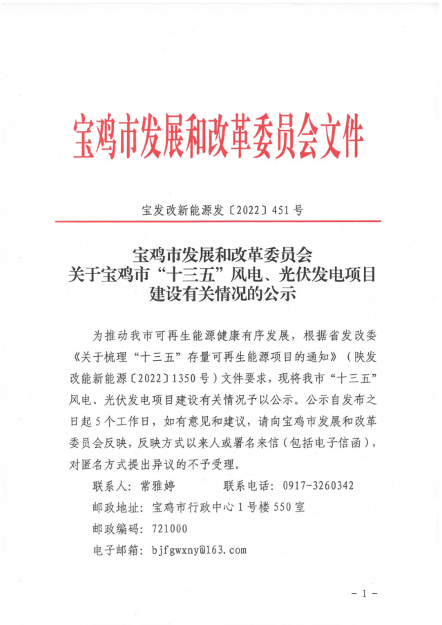 根據(jù)省發(fā)展改革委《關于梳理“十三五”存量可再生能源項目的通知》(陜發(fā)改能新能源〔2022〕1350號)文件要求,現(xiàn)將我市擬上報省發(fā)改委“十三五”風電、光伏發(fā)電項目建設有關情況予以公示。公示自發(fā)布之日起5個工作日,如有意見和建議,請向渭南市發(fā)展和改革委員會反映,反映方式以來人或署名來信(包括電子信函),對匿名方式提出異議的不予受理。