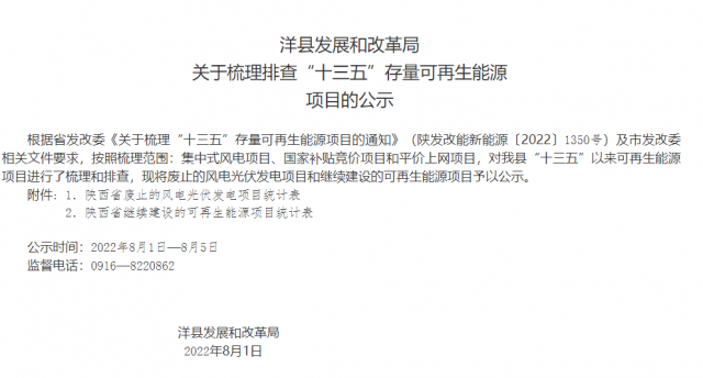 按照省發(fā)展改革委《關于梳理“十三五”存量可再生能源項目的通知》(陜發(fā)改能新能源〔2022〕1350)有關要求,我委對全市2019-2020年國家補貼競價項目、省級平價上網(wǎng)項目進行了梳理匯總,西安中旭新能源有限公司40兆瓦光伏電站項目于2020年5月通過備案,截至目前,該項目仍未開工建設。經(jīng)我委與項目所在地臨潼區(qū)確認,情況屬實,經(jīng)研究,認為該項目為本次梳理可再生能源廢止項目?,F(xiàn)將項目情況通過西安市發(fā)改委官方網(wǎng)站(xadrc.xa.gov.cn)進行公示(詳見附表),公示時間自2022年8月12日起至18日止,請社會各界予以監(jiān)督。