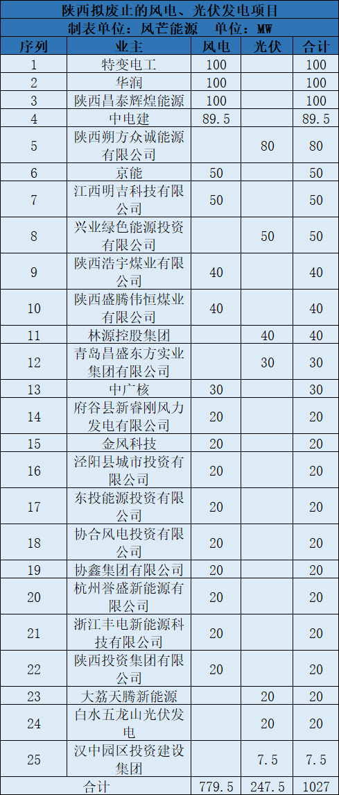 根據(jù)各地區(qū)《通知》梳理,6個地區(qū)共廢止25個共計779.5MW風電項目,7個共計247.5MW光伏項目。