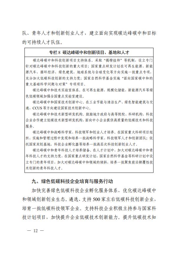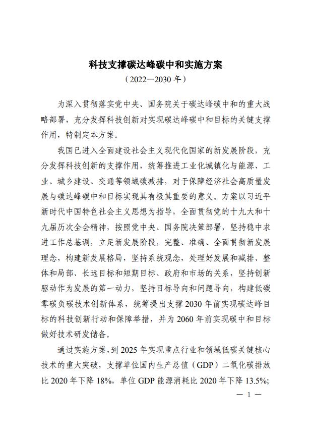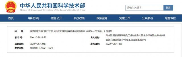 8月18日,科技部、國家發(fā)改委、工信部、生態(tài)環(huán)境部、住建部、交通部、中科院、工程院、國家能源局等九部門聯(lián)合印發(fā)《科技支撐碳達(dá)峰碳中和實施方案(2022—2030年)》。
