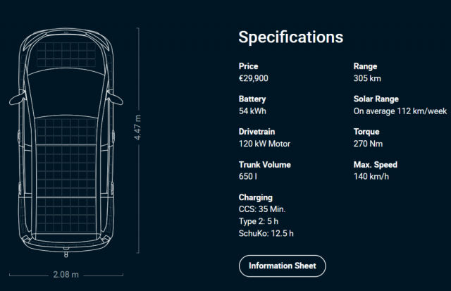 這款太陽(yáng)能電動(dòng)車Sion配一臺(tái)120kW電機(jī),可以產(chǎn)生馬力161Ps,最大輸出扭矩270N·m。