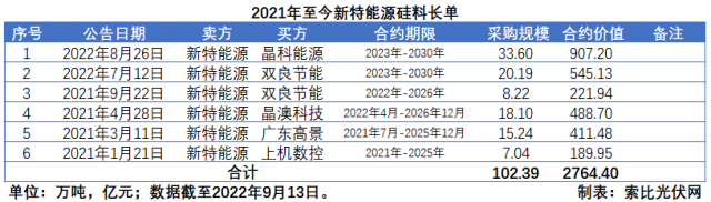 新特能源長單規(guī)模達(dá)到102.39萬噸,合約價(jià)值2764.40億元,主要客戶有晶科能源、晶澳科技、上機(jī)數(shù)控、雙良節(jié)能等。值得注意的是,公司分別與晶科能源和雙良節(jié)能簽下了持續(xù)至2030年的8年長約,僅次于10多年前無錫尚德等組件龍頭簽下的10年長約。