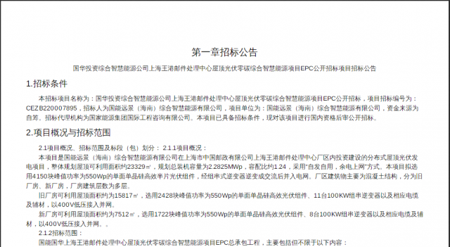 2022年對于郵件處理中心裝光伏的投資也逐漸火熱。9月13日,上海市中國郵政有限公司廠區(qū)內(nèi)投資建設(shè)的分布式屋頂光伏發(fā)電項目,明確新舊廠房都要裝光伏!整體規(guī)劃屋頂可利用面積約23329㎡,新、舊廠房可利用屋頂面積分別約為7512㎡、15817㎡,規(guī)劃總裝機(jī)容量2.2825MWp,采用“自發(fā)自用,余電上網(wǎng)"方式。共計選用4150塊單面單晶硅高效光伏組件。