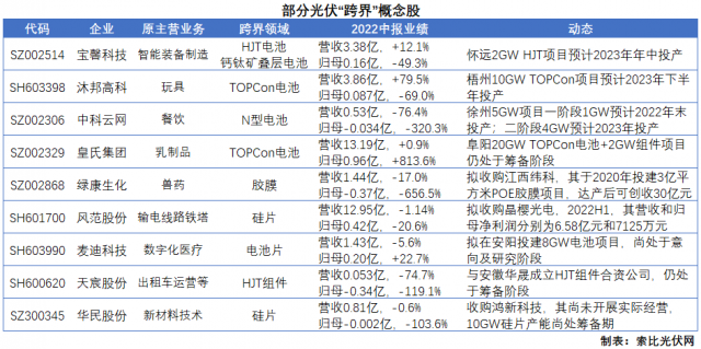 隨著“跨界潮”的愈演愈烈,A股市場(chǎng)中也有越來(lái)越多的企業(yè)有望復(fù)制上機(jī)數(shù)控、雙良節(jié)能的發(fā)展軌跡。在索比光伏網(wǎng)整理的“跨界”概念股名單中,多數(shù)企業(yè)的業(yè)績(jī)基數(shù)均較低,部分企業(yè)甚至還出現(xiàn)了一定程度的虧損。