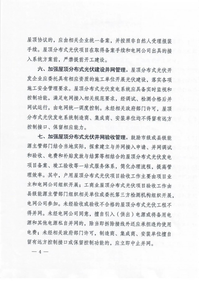 工商業(yè)屋頂分布式光伏項(xiàng)目驗(yàn)收工作由縣級(jí)能源主管部門組織相關(guān)單位或委托第三方檢測機(jī)構(gòu)組織開展,電網(wǎng)公司參加。未經(jīng)驗(yàn)收或驗(yàn)收不合格的屋頂分布式光伏工程不得并網(wǎng)。未經(jīng)電網(wǎng)公司同意,擅自引入(供出)電源或?qū)溆秒娫春推渌娫此阶圆⒕W(wǎng)的,除當(dāng)即拆除接線外還應(yīng)承擔(dān)違約使用 電費(fèi);未經(jīng)相關(guān)政府部門許可,制造商、集成商、安裝單位擅自留有遠(yuǎn)方控制接口或保留控制功能的,應(yīng)立即中止并網(wǎng)。