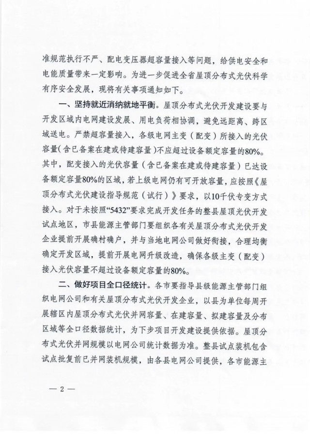 對于未按照“5432”要求完成開發(fā)任務(wù)的整縣屋頂光伏開發(fā)試點(diǎn)地區(qū),市縣能源主管部門要組織各有關(guān)屋頂分布式光伏開發(fā) 企業(yè)提前開展確村確戶,并與當(dāng)?shù)仉娋W(wǎng)公司做好銜接,合理均衡確定開發(fā)區(qū)域,提前開展電網(wǎng)升級(jí)改造,確保各級(jí)主變(配變)接入光伏容量不超過設(shè)備額定容量的80%。